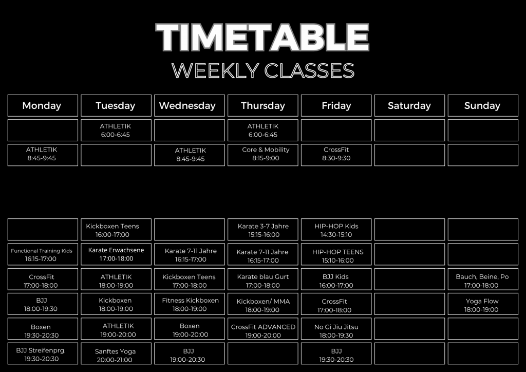- Schüler & Azubis (U18) erhalten 10% Ermäßigung für Open Gym; Vertrag für alle Kurse: 65€/mtl.